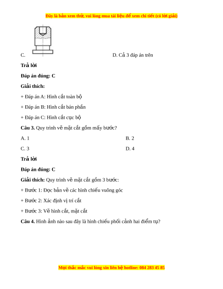 Đây là bản xem th , vu ử i lòng mua tài li u ệ đ xe ể m chi ti t (c ế ó l i ờ gi i ả ) C. D. C 3 đáp án ả trên Trả l i ờ Đáp án đúng: C Giải thích: + Đáp án A: Hình c t ắ toàn bộ + Đáp án B: Hình c t ắ bán ph n ầ + Đáp án C: Hình c t ắ c c b ụ ộ Câu 3. Quy trình v m ẽ t ặ c t ắ g m ồ m y b ấ ư c? ớ A. 1 B. 2 C. 3 D. 4 Trả l i ờ Đáp án đúng: C