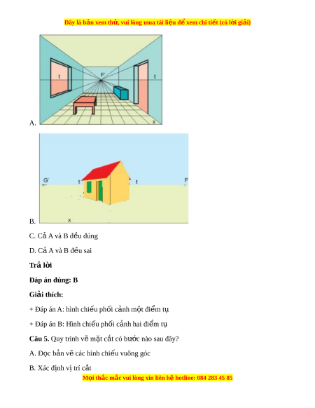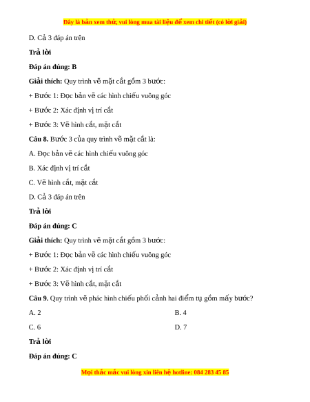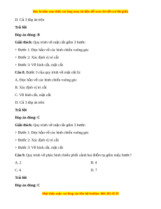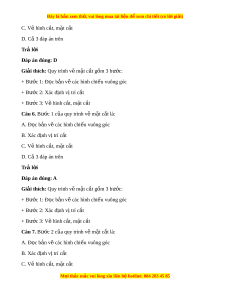 Đây là bản xem th , vu ử i lòng mua tài li u ệ đ xe ể m chi ti t (c ế ó l i ờ gi i ả ) A. B. C. Cả A và B đ u đúng ề D. C ả A và B đ u s ề ai Trả l i ờ Đáp án đúng: B Giải thích: + Đáp án A: hình chi u ph ế i ố c nh m ả t ộ đi m ể tụ + Đáp án B: Hình chi u ph ế i ố c nh hai ả đi m ể tụ Câu 5. Quy trình v m ẽ t ặ c t ắ có bư c nào s ớ au đây? A. Đ c ọ b n v ả các ẽ hình chi u vuông góc ế B. Xác đ nh v ị t ị rí c t ắ M i