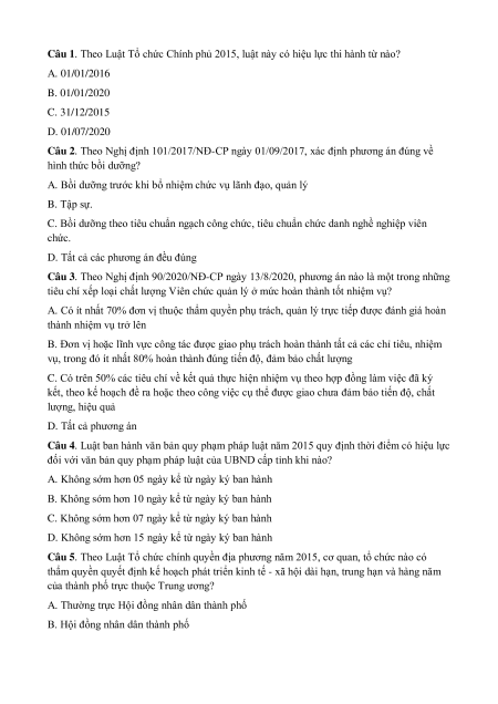Câu 1. Theo Luật Tổ chức Chính phủ 2015, luật này có hiệu lực thi hành từ nào? A. 01/01/2016 B. 01/01/2020 C. 31/12/2015 D. 01/07/2020