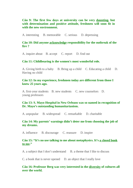 Câu 11: Childbearing is the women's most wonderful role. A. Giving birth to a baby B. Bring up a child C. Educating a child D. Having no child