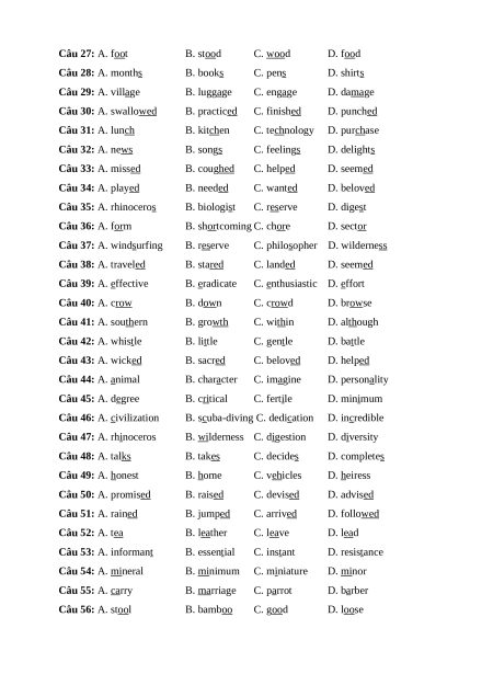 Câu 37: A. windsurfing B. reserve C. philosopher D. wilderness Câu 38: A. traveled B. stared C. landed D. seemed Câu 39: A. effective B. eradicate C. enthusiastic D. effort Câu 40: A. crow B. down C. crowd D. browse Câu 41: A. southern B. growth C. within D. although Câu 42: A. whistle B. little C. gentle D. battle Câu 43: A. wicked B. sacred C. beloved D. helped Câu 44: A. animal B. character C. imagine D. personality Câu 45: A. degree B. critical C. fertile D. minimum