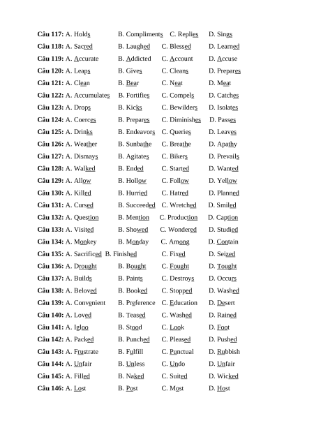 B. Handkerchief C. Mischievous D. Children Câu 107: A. Listen B. Essential C. Often D. Castle Câu 108: A. This B. Mine C. File D. Night Câu 109: A. Blamed B. Dogged C. Played D. Lied Câu 110: A. Anxiety B. Conquer C. Penguin D. Bunny Câu 111: A. Opened B. Crooked C. Pleased D. Explained Câu 112: A. Says B. Plays C. Pays D. Delays Câu 113: A. Kicked B. Laughed C. Naked D. Watched Câu 114: A. Where B. Here C. Fear D. Dear Câu 115: A. Coughed B. Ploughed C. Laughed D. Fixed Câu 116: A. Soften B. Fifteen C. Enter D. Party