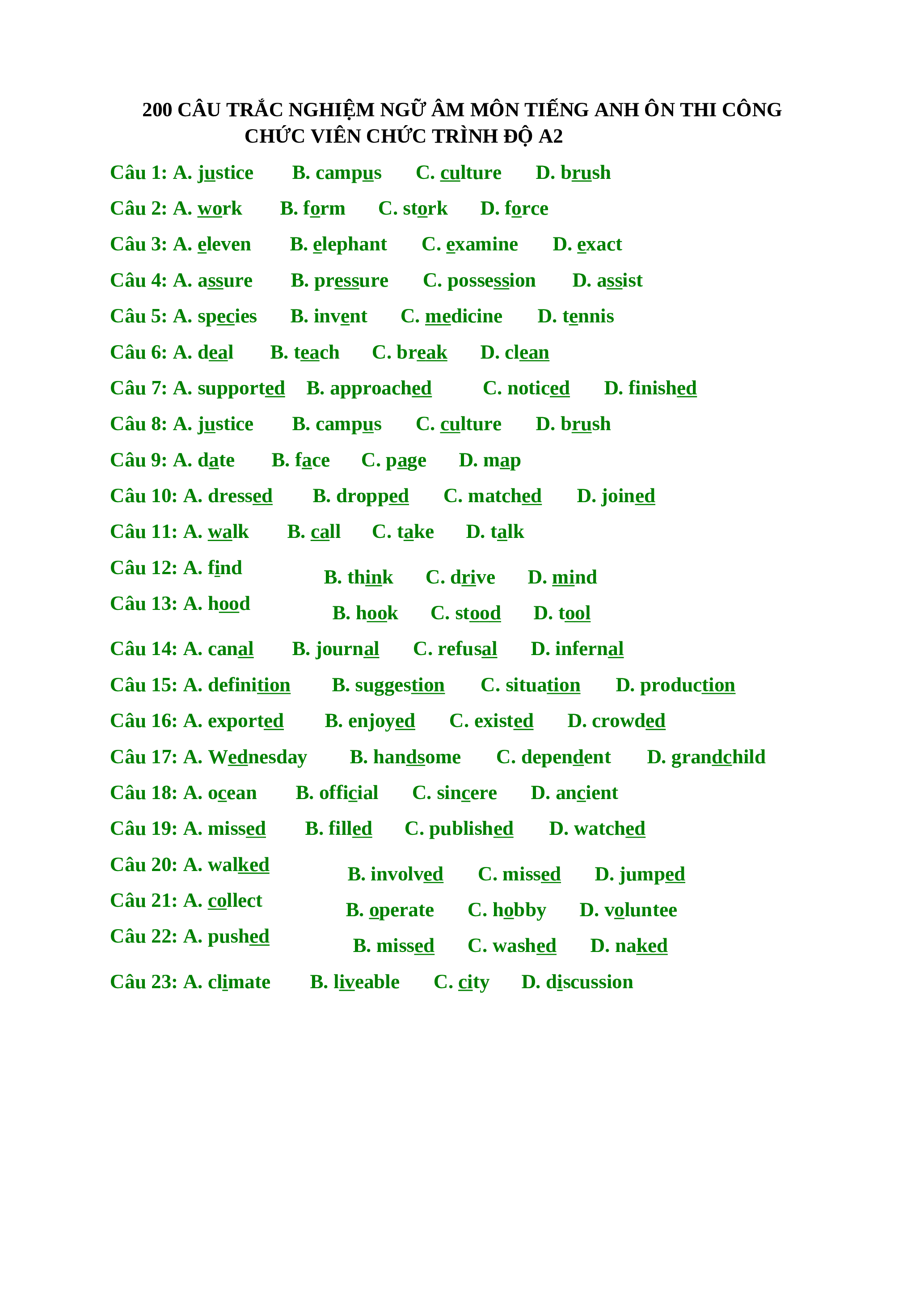 CHỨC VIÊN CHỨC TRÌNH ĐỘ A2 Câu 1: A. ju stice B. campus C. culture D. brush Câu 2: A. w o rk B. form C. stork D. fo rce Câu 3: A. eleven B. elephant C. examine D. exact Câu 4: A. as sure B. pressure C. possession D. assist Câu 5: A. species B. invent C. medicine D. tennis Câu 6: A. deal B. teach C. bre a k D. clean