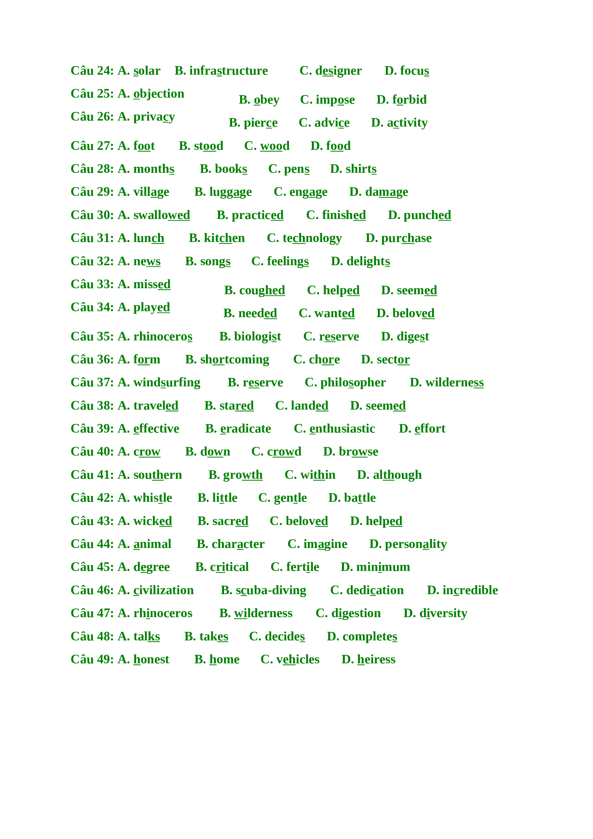 Câu 24: A. solar B. infrastructure C. designer D. focus Câu 25: A. objection B. obey C. impo se D. forbid Câu 26: A. privacy B. pierc e C. advice D. activity Câu 27: A. foot B. sto o d C. w oo d D. fo o d Câu 28: A. months B. books C. pens D. shirts Câu 29: A. village B. lugga ge C. enga ge D. damage Câu 30: A. swallowed B. practiced C. finished D. punched Câu 31: A. lunch B. kitchen C. tec h nology D. purchase Câu 32: A. news B. songs C. feelings D. delights Câu 33: A. missed B. coughed C. helped D. seemed Câu 34: A. played B. needed C. wanted D. beloved Câu 35: A. rhinoceros B. biologist C. reserve D. diges t Câu 36: A. form B. shortcoming C. cho r e D. secto r Câu 37: A. windsurfing B. reserve C. philosopher D. wildernes s Câu 38: A. traveled B. star e d C. landed D. seemed Câu 39: A. effective B. eradicate C. enthusiastic D. effort Câu 40: A. cr o w B. down C. cr o w d D. bro w se Câu 41: A. sout h ern B. growth C. wit h in D. alt h ough Câu 42: A. whistle B. lit tle C. gentle D. bat tle Câu 43: A. wicked B. sacre d C. beloved D. helped Câu 44: A. animal B. character C. imagine D. persona lity Câu 45: A. degree B. critical C. fertile D. minimum