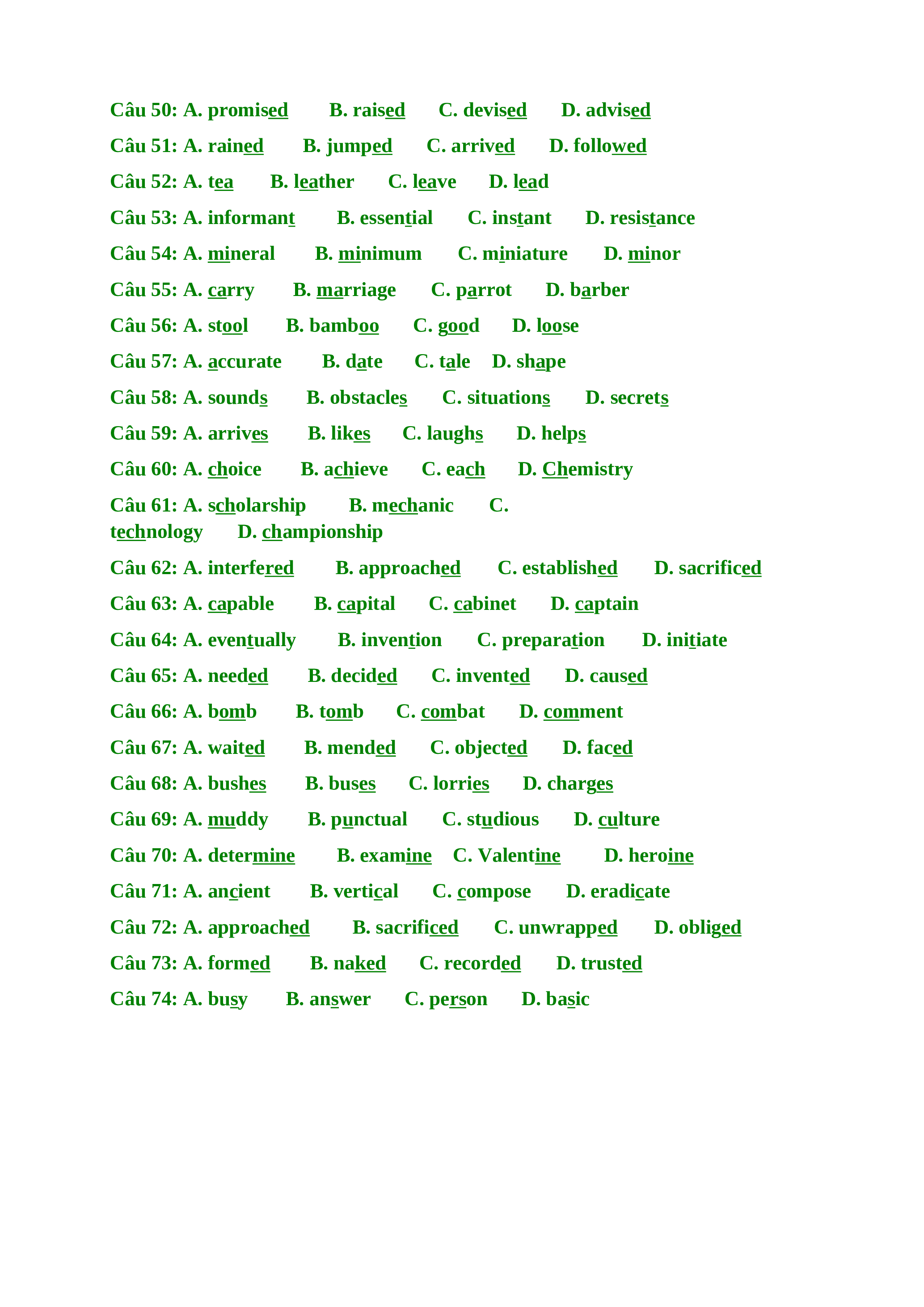 Câu 46: A. civilization B. scuba-diving C. dedication D. inc redible Câu 47: A. rhinoceros B. wilderness C. digestion D. diversity Câu 48: A. talks B. takes C. decides D. completes Câu 49: A. honest B. home C. vehicles D. h eiress Câu 50: A. promised B. raised C. devised D. advise d Câu 51: A. rained B. jumpe d C. arrived D. follow e d Câu 52: A. tea B. leather C. leave D. lead Câu 53: A. informant B. essential C. instant D. resistance Câu 54: A. mineral B. minimum C. miniature D. minor Câu 55: A. carry B. marriage C. parrot D. barber Câu 56: A. sto o l B. bambo o C. goo d D. loo se Câu 57: A. accurate B. date C. tale D. shape Câu 58: A. sounds B. obstacles C. situations D. secrets Câu 59: A. arrives B. likes C. laughs D. helps Câu 60: A. choice B. achieve C. each D. C h emistry Câu 61: A. scholarship B. me ch anic C. technology D. c h ampionship