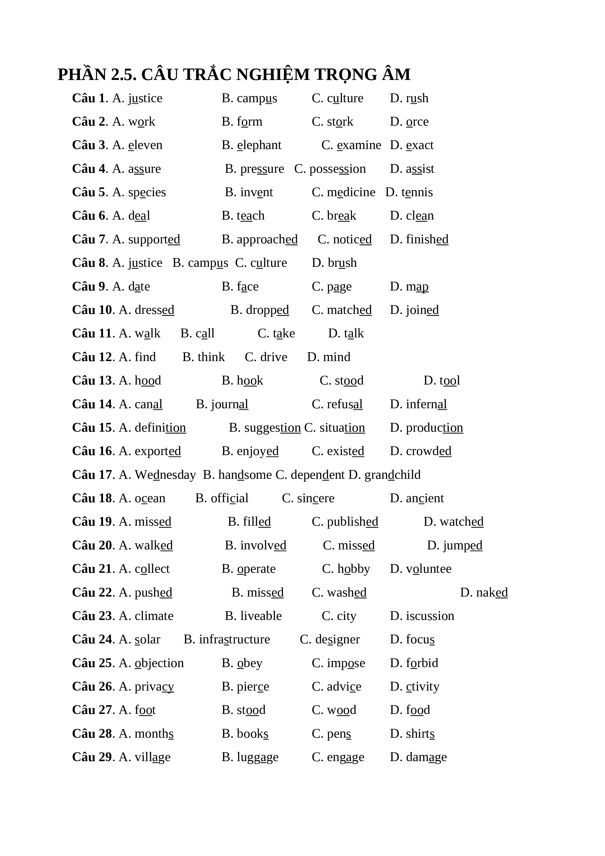 PHẦN 2.5. CÂU TRẮC NGHIỆM TRỌNG ÂM Câu 1. A. justice B. campus C. culture D. rush Câu 2. A. work B. form C. stork D. orce Câu 3. A. eleven