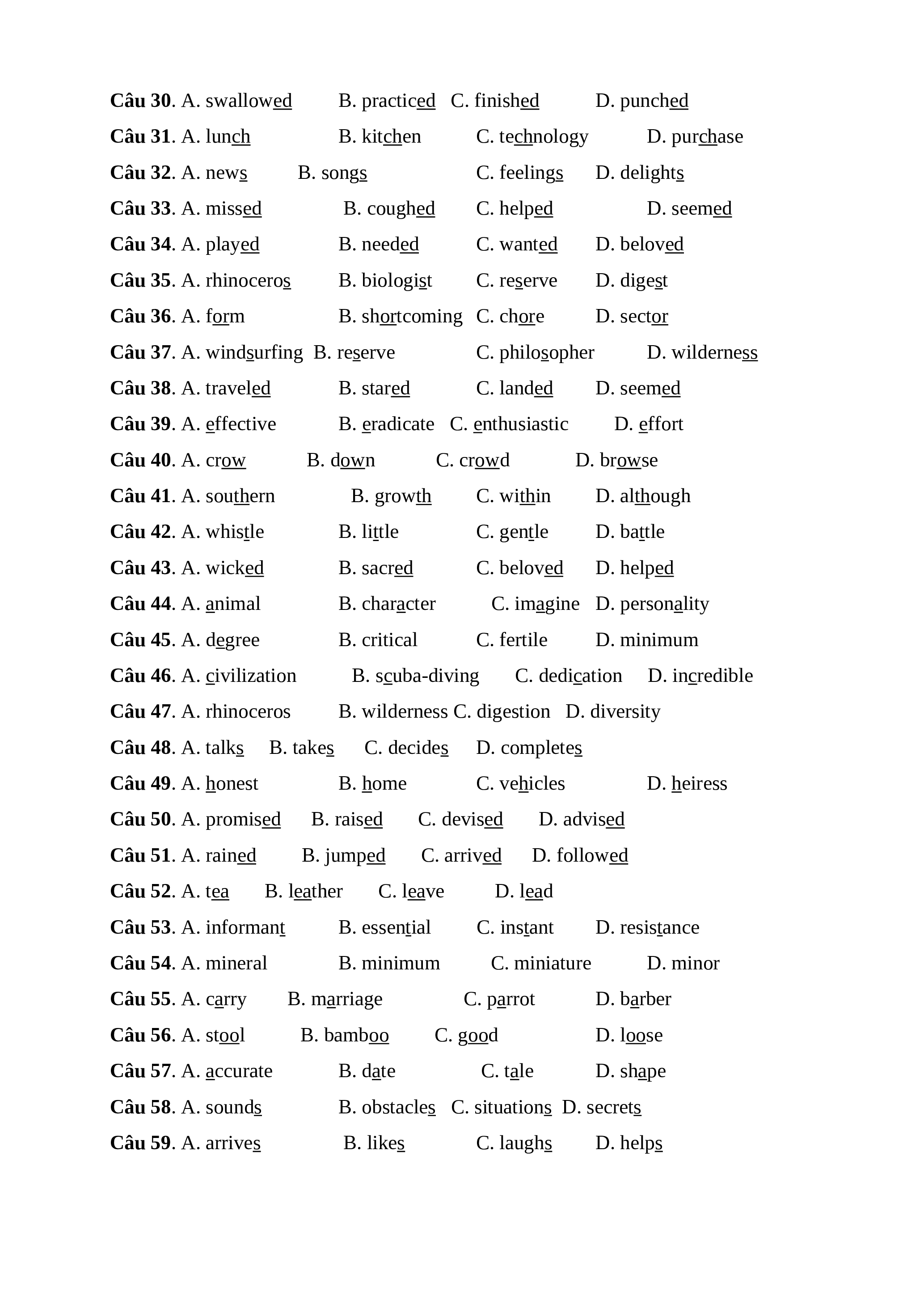 Câu 32. A. news B. songs C. feelings D. delights Câu 33. A. missed B. coughed C. helped D. seemed Câu 34. A. played B. needed C. wanted D. beloved Câu 35. A. rhinoceros B. biologist C. reserve D. digest Câu 36. A. form B. shortcoming C. chore D. sector