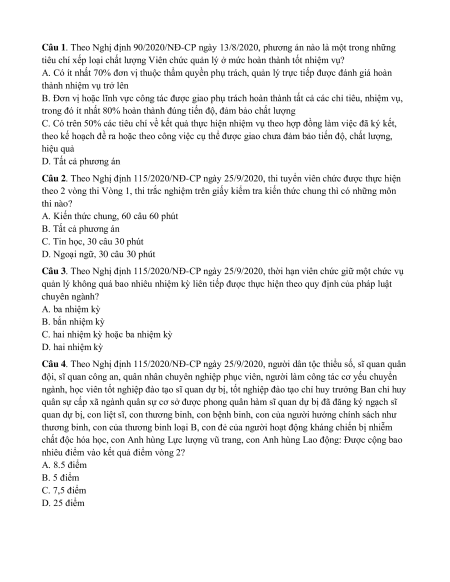 Câu 2. Theo Nghị định 115/2020/NĐ-CP ngày 25/9/2020, thi tuyển viên chức được thực hiện