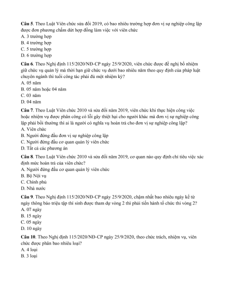 Câu 3. Theo Nghị định 115/2020/NĐ-CP ngày 25/9/2020, thời hạn viên chức giữ một chức vụ