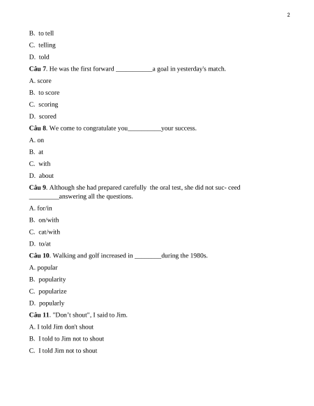Câu 11. "Don’t shout", I said to Jim. A. I told Jim don't shout B. I told to Jim not to shout C. I told Jim not to shout 3 D. I said to Jim don't shout.