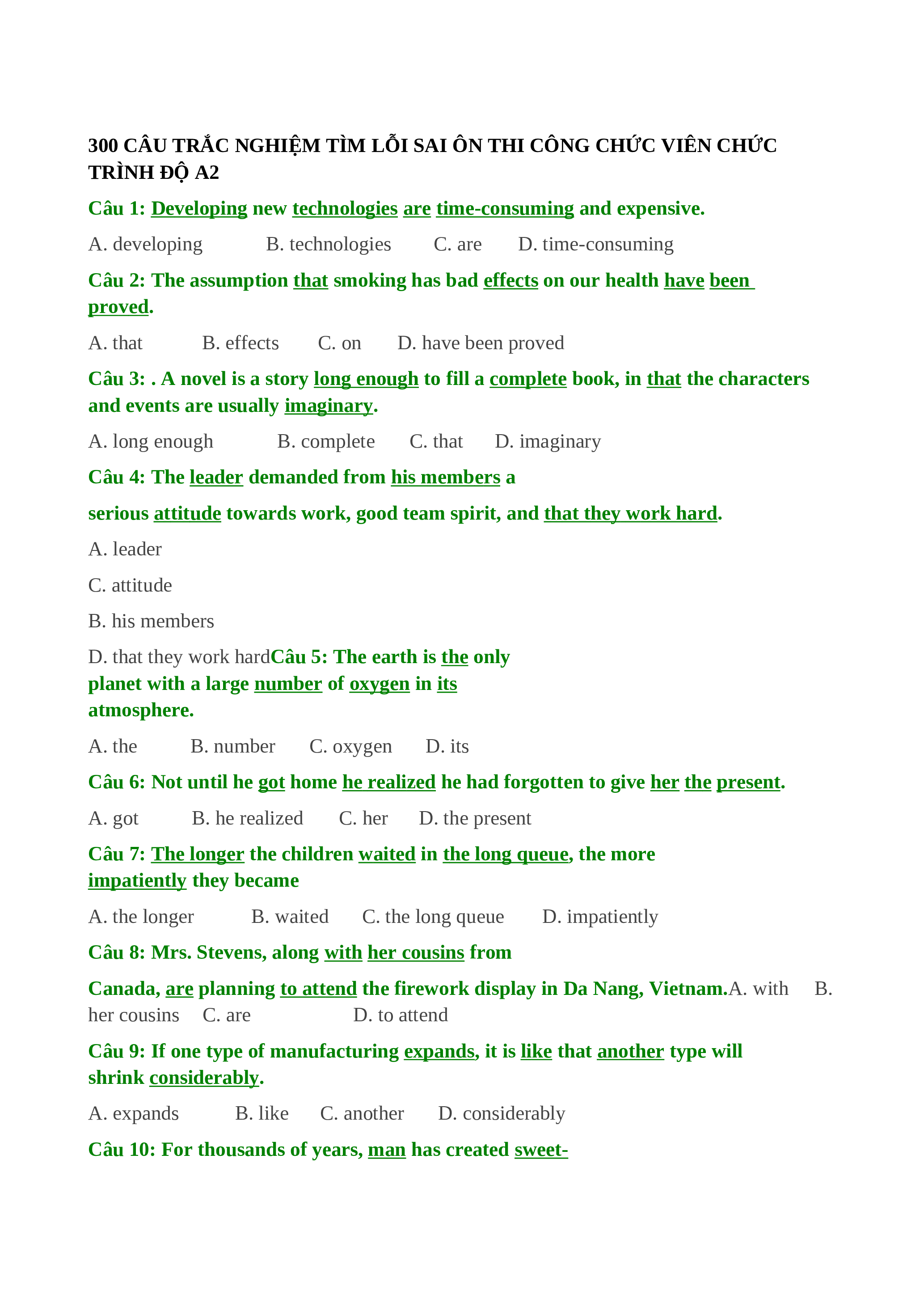 300 CÂU TRẮC NGHIỆM TÌM LỖI SAI ÔN THI CÔNG CHỨC VIÊN CHỨC TRÌNH ĐỘ A2 Câu 1: De v eloping new tech n olo g ies are time - consumi n g and expensive. A. developing B. technologies C. are D. time-consuming