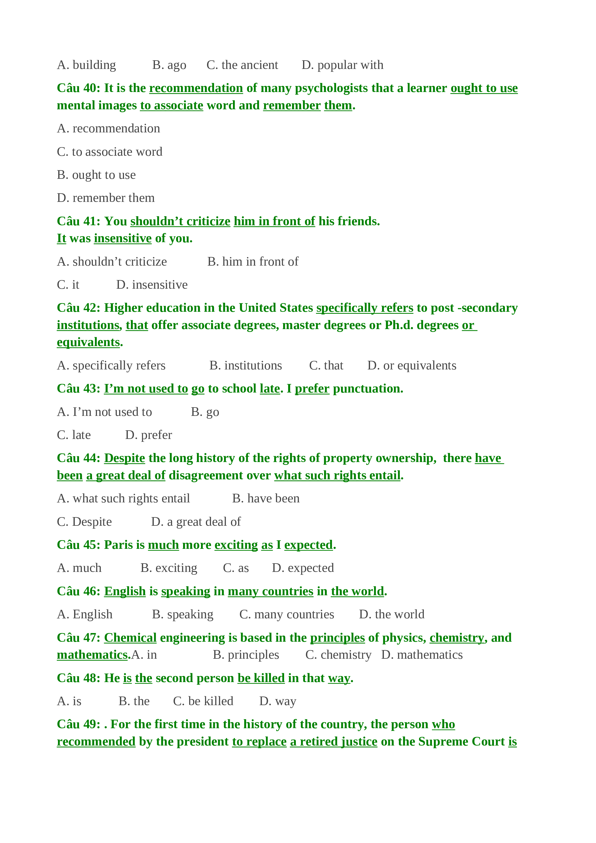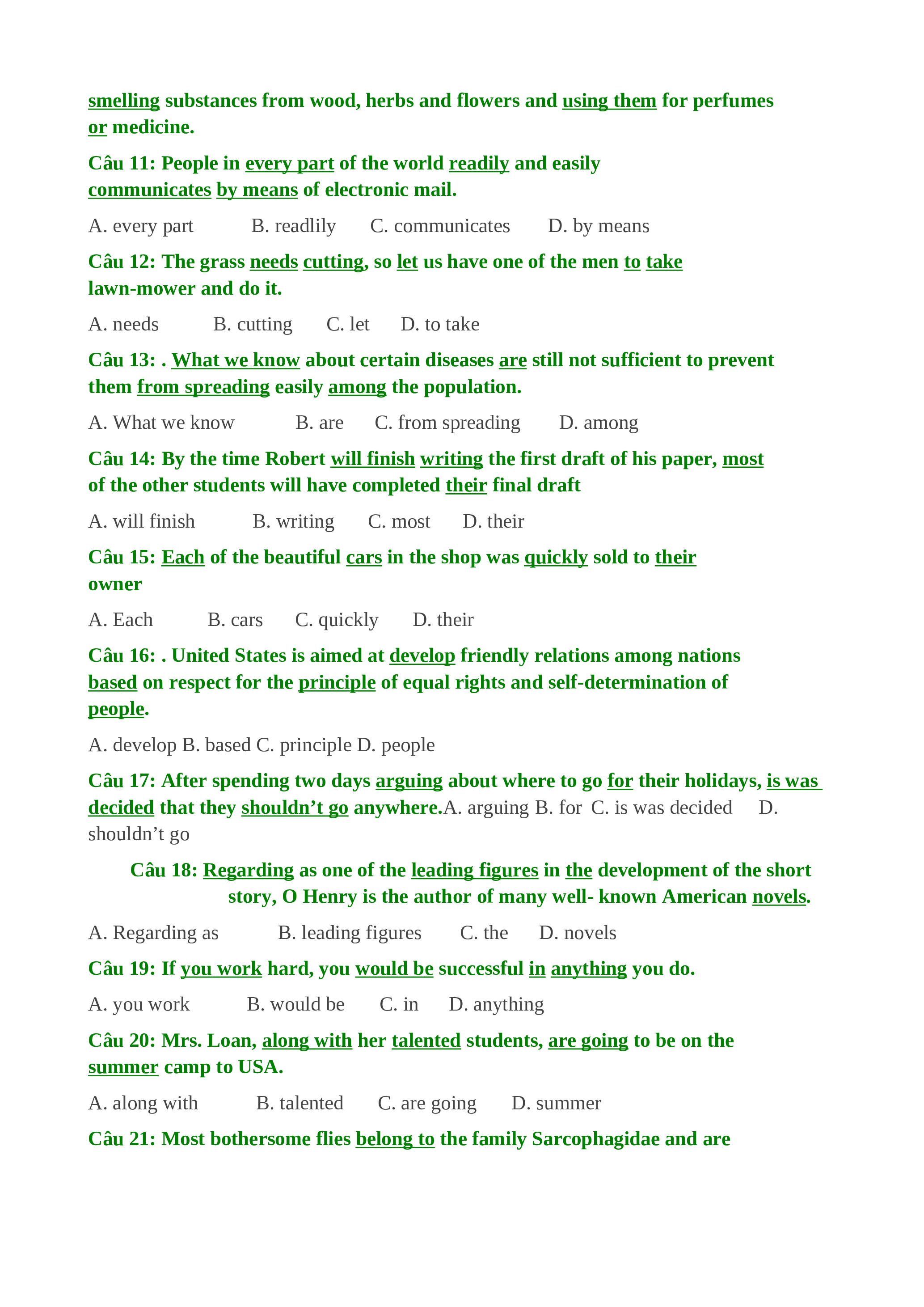 story, O Henry is the author of many well- known American novel s . A. Regarding as B. leading figures C. the D. novels Câu 19: If you w ork hard, you w ould b e successful in any t hing you do. A. you work B. would be C. in D. anything Câu 20: Mrs. Loan, alo n