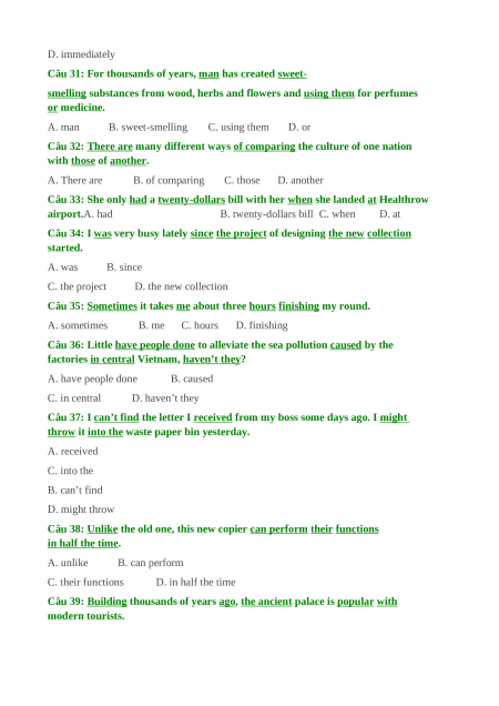 smelling substances from wood, herbs and flowers and using t h em for perfumes o r medicine. A. man B. sweet-smelling C. using them D. or Câu 32: The r e a