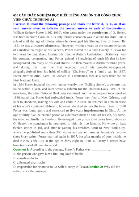 650 CÂU TRẮC NGHIỆM ĐỌC HIỂU TIẾNG ANH ÔN THI CÔNG CHỨC
