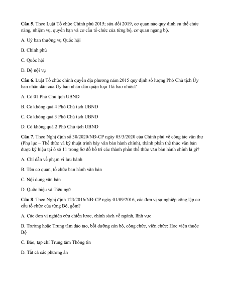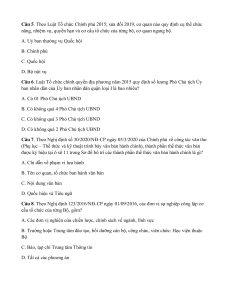 Câu 1. Theo Luật Tổ chức Chính phủ 2015, luật này có hiệu lực thi hành từ nào? A. 01/01/2016 B. 01/01/2020 C. 31/12/2015 D. 01/07/2020