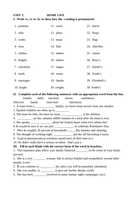 I. Write /s/, /z/ or /iz/ to show how the -s ending is pronounced. 1. potatoes 11. caves 21. learns 2. rubs 12. plays 22. Stops 3. cooks 13. maps 23. Digs 4. rises 14. flats 24. churches 5. clothes 15. bathes 25. comes 6. lengths 16. bathes 26. Rose’s 7. calculates 17. stages 27. Daniel’s 8. reads 18. wears 28. Frank’s 9. massages 19. thanks 29. Elizabeth’s 10. laughs 20. coughs 30. Smith’s