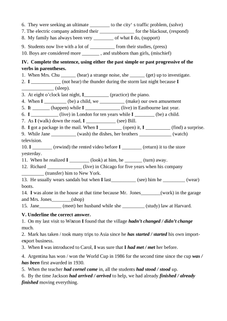 IV. Complete the sentence, using either the past simple or past progressive of the verbs in parentheses.