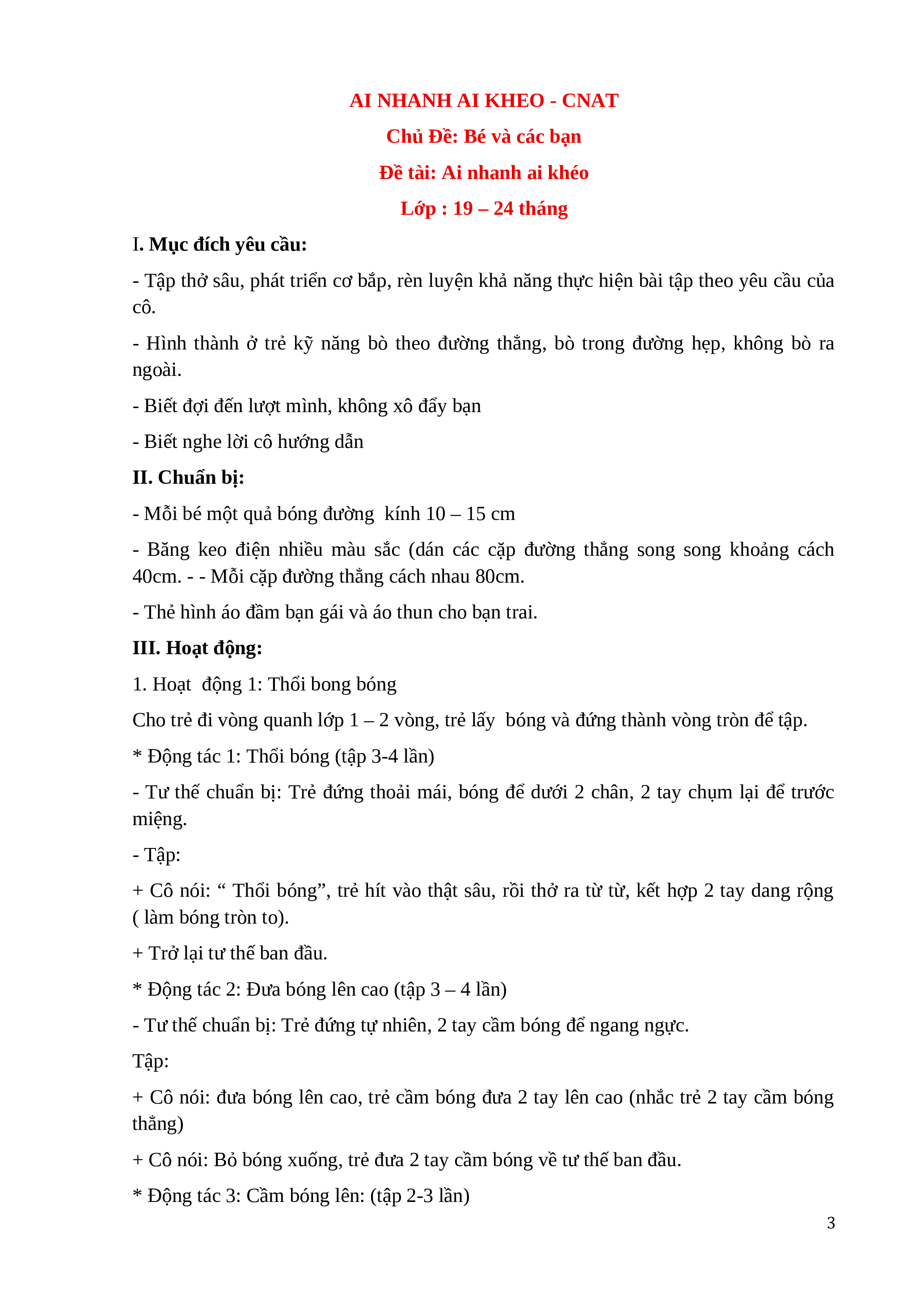 đứng ở cuối hàng. Cho trẻ thực hiện 2-3 lần. Nhắc nhở trẻ biết đợi tới lượt mình. Trò chơi: ai nhanh ai khéo