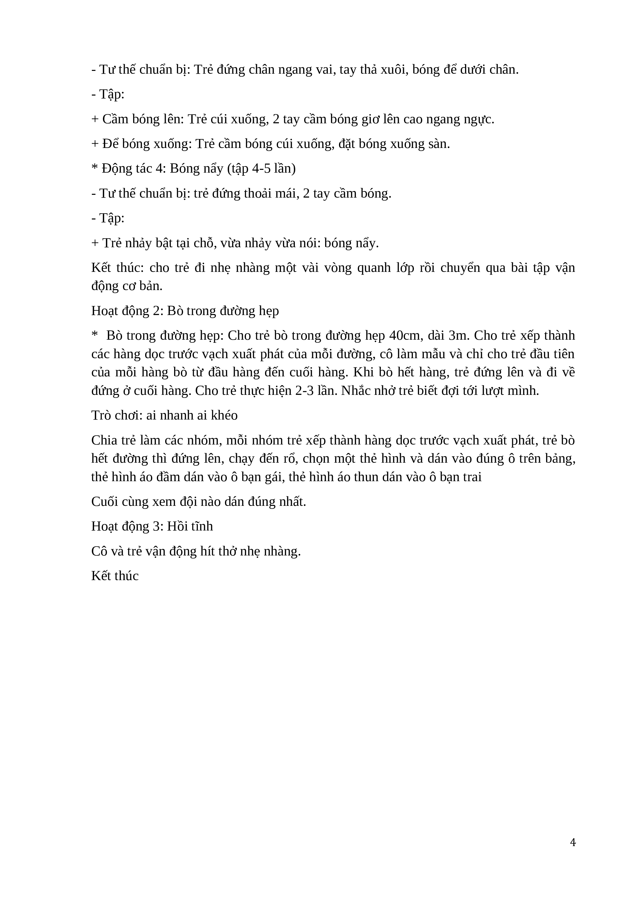 - Tư thế chuẩn bị: Trẻ đứng chân ngang vai, tay thả xuôi, bóng để dưới chân. - Tập: