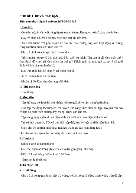 Thời gian thực hiện: 3 tuần từ 26/8-20/9/2015 I. Đón trẻ