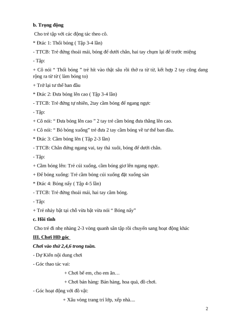 - Cho trẻ đi vòng quanh nơi tập 1-2 vòng, trẻ lấy bóng và đứng thành vòng tròn để tập. 1 b. Trọng động