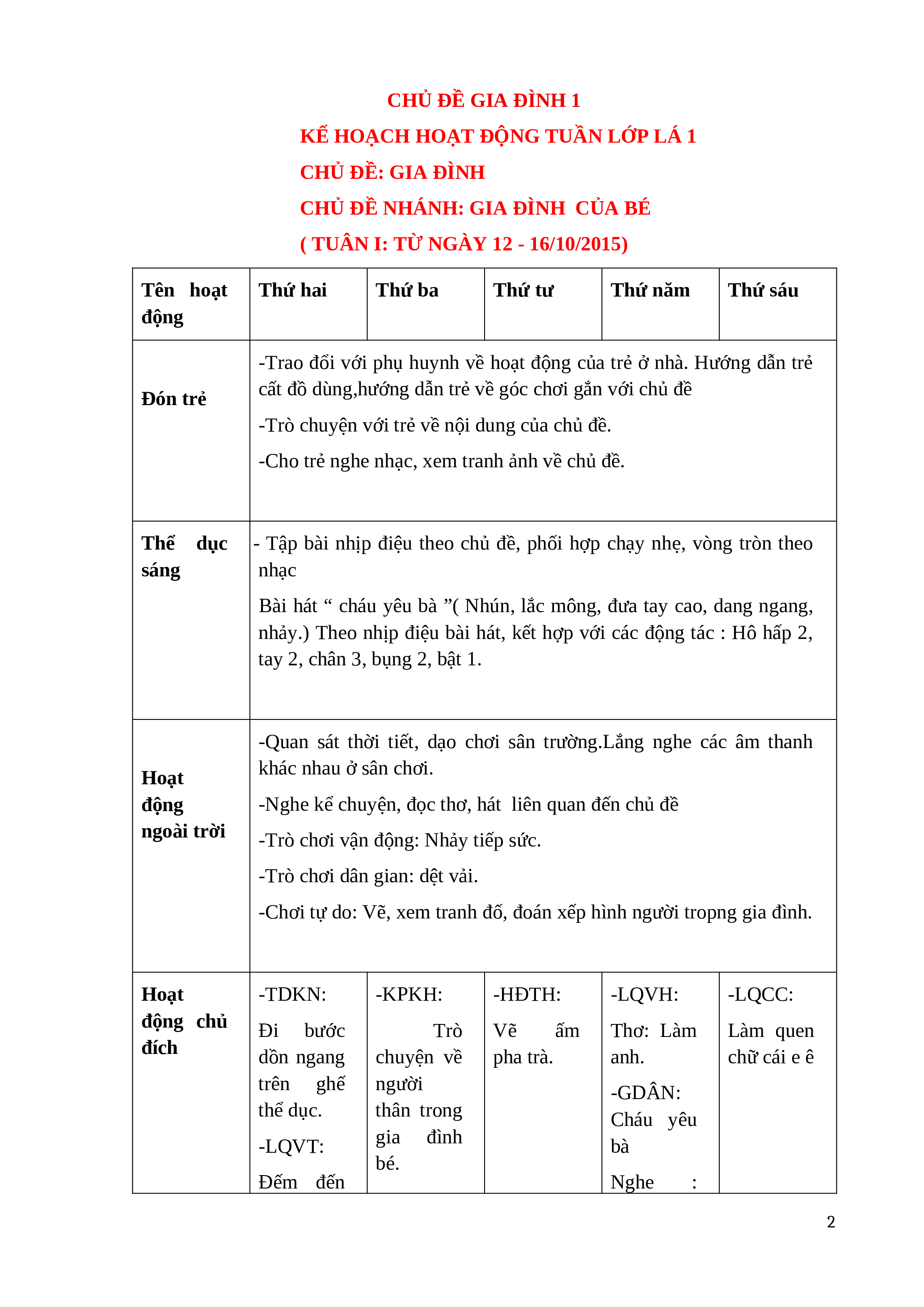 KẾ HOẠCH HOẠT ĐỘNG TUẦN LỚP LÁ 1 CHỦ ĐỀ: GIA ĐÌNH