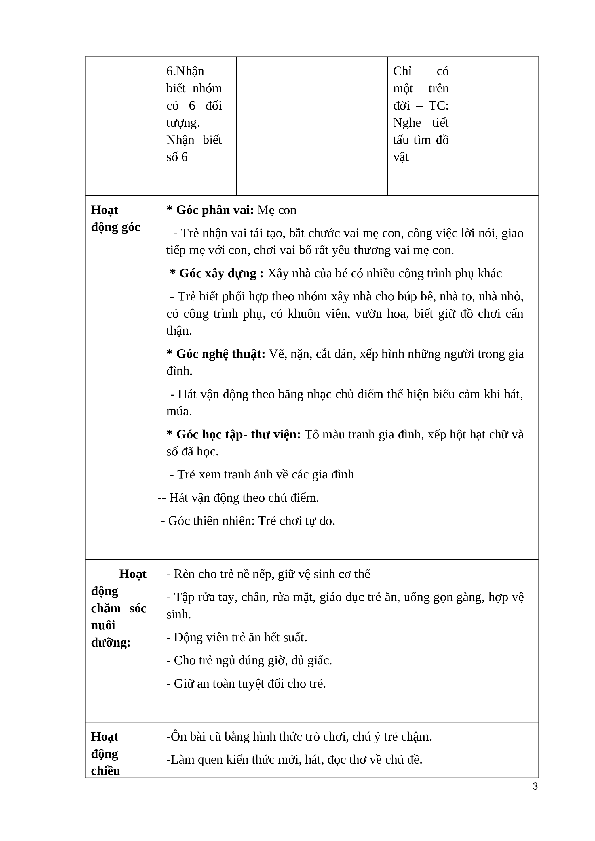 -Chơi tự do: Vẽ, xem tranh đố, đoán xếp hình người tropng gia đình. Hoạt -TDKN: -KPKH: -HĐTH: -LQVH: -LQCC: động chủ Đi bước Trò Vẽ ấm Thơ: Làm Làm quen đích dồn ngang chuyện về pha trà. anh. chữ cái e ê trên ghế người -GDÂN: thể dục. thân trong Cháu yêu -LQVT: gia đình bà bé. Đếm đến Nghe : 2 6.Nhận Chỉ có biết nhóm một trên có 6 đối đời – TC: tượng. Nghe tiết Nhận biết tấu tìm đồ số 6 vật Hoạt