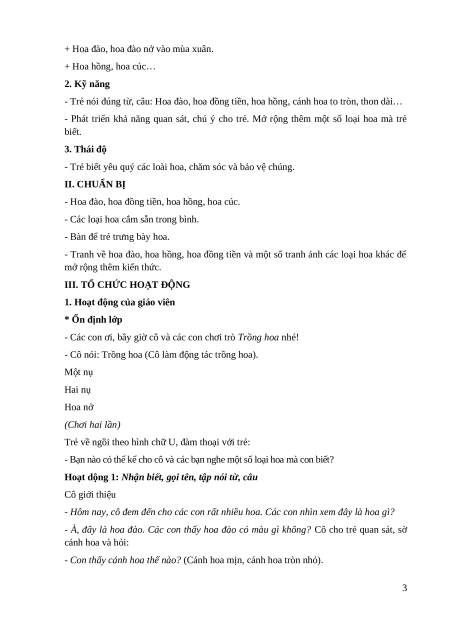 - Phát triển khả năng quan sát, chú ý cho trẻ. Mở rộng thêm một số loại hoa mà trẻ biết. 3. Thái độ