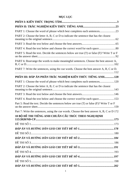 PHẦN III: ĐÁP ÁN PHẦN TRẮC NGHIỆM KIẾN THỨC TIẾNG ANH.............120