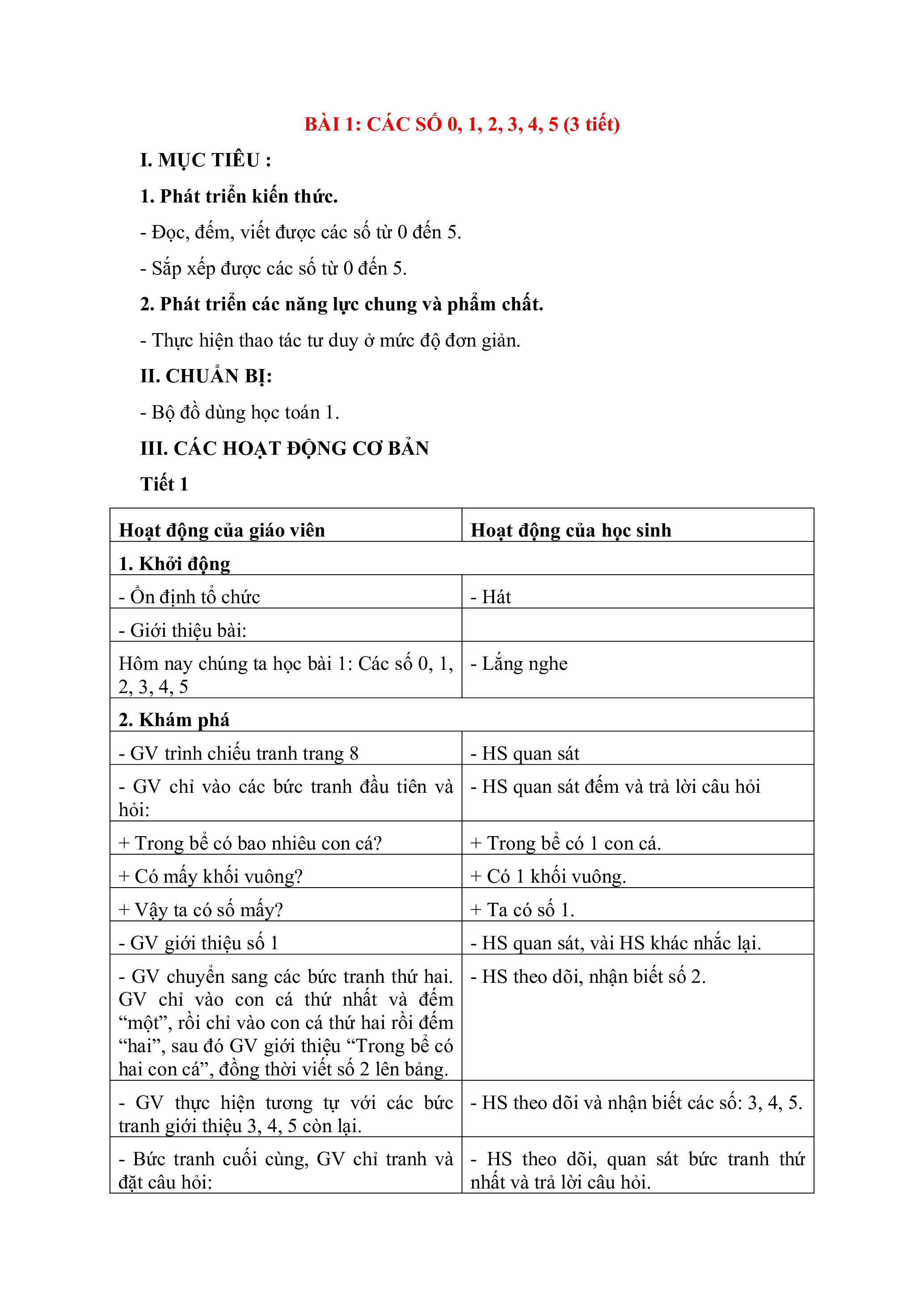 BÀI 1: CÁC SỐ 0, 1, 2, 3, 4, 5 (3 tiết) I. MỤC TIÊU :