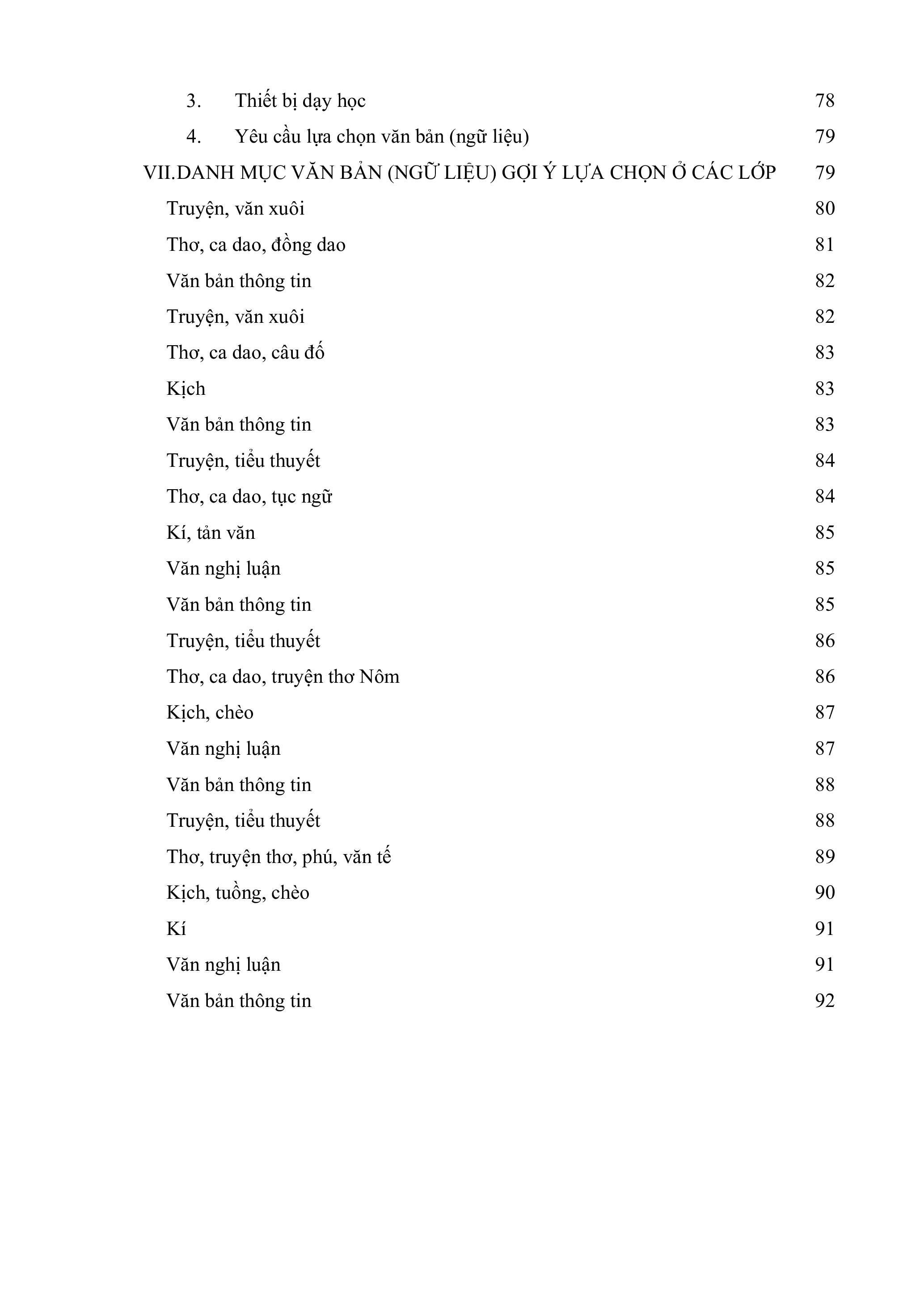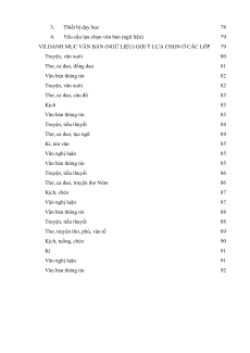 VII.DANH MỤC VĂN BẢN (NGỮ LIỆU) GỢI Ý LỰA CHỌN Ở CÁC LỚP 79 Truyện, văn xuôi 80 Thơ, ca dao, đồng dao 81 Văn bản thông tin 82 Truyện, văn xuôi 82 Thơ, ca dao, câu đố 83 Kịch 83 Văn bản thông tin 83 Truyện, tiểu thuyết 84 Thơ, ca dao, tục ngữ 84 Kí, tản văn 85 Văn nghị luận 85 Văn bản thông tin 85 Truyện, tiểu thuyết 86