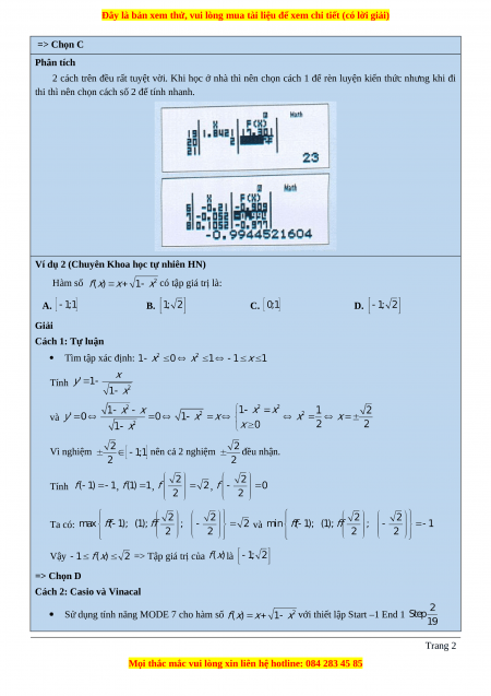 Ví dụ 2 (Chuyên Khoa học tự nhiên HN) Hàm số có tập giá trị là: A. B. C. D. Giải Cách 1: Tự luận Tìm tập xác định: Tính và Vì nghiệm nên cả 2 nghiệm đều nhận. Tính , , , Ta có: và Vậy => Tập giá trị của là => Chọn D Cách 2: Casio và Vinacal