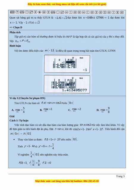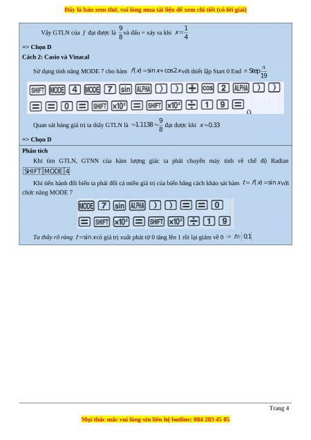Vậy GTLN của f đạt được là và dấu = xảy ra khi => Chọn D Cách 2: Casio và Vinacal