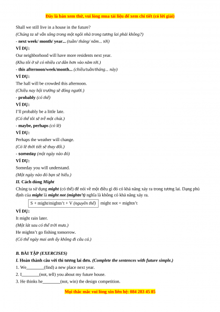I. Hoàn thành câu với thì tương lai đơn. (Complete the sentences with future simple.)