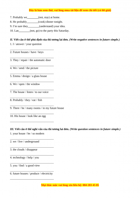 II. Viết câu ở thể phủ định của thì tương lai đơn. (Write negative sentences in future simple.)