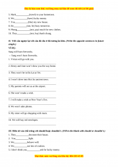 II. Viết câu ngược lại với câu đã cho ở thì tương lai đơn. (Write the opposite sentences in future simple.) VÍ DỤ: Sang will burn fireworks.