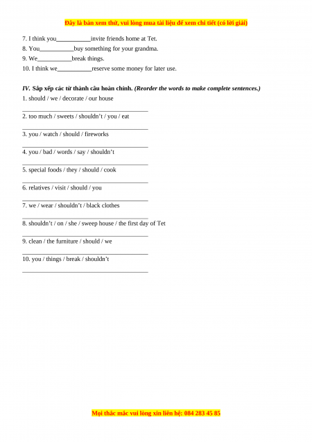 IV. Sắp xếp các từ thành câu hoàn chỉnh. (Reorder the words to make complete sentences.)