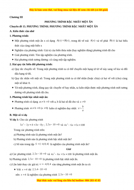 Chuyên đề 15. PHƯƠNG TRÌNH. PHƯƠNG TRÌNH BẬC NHẤT MỘT ẨN