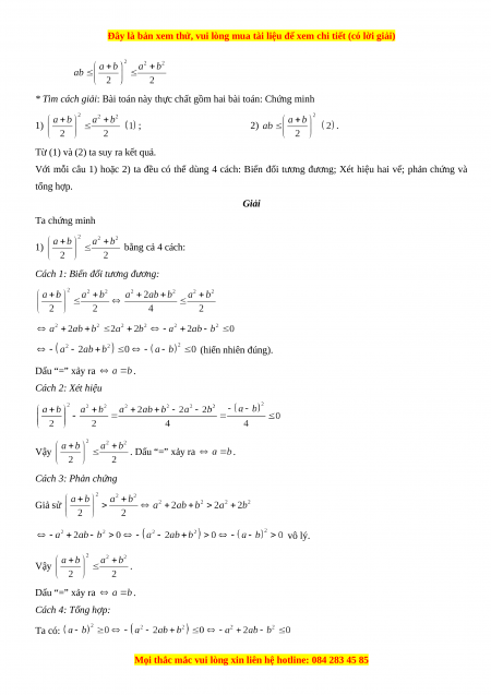 Cách 1: Biến đổi tương đương: (hiển nhiên đúng). Dấu “=” xảy ra . Cách 2: Xét hiệu Vậy . Dấu “=” xảy ra . Cách 3: Phản chứng Giả sử vô lý. Vậy . Dấu “=” xảy ra . Cách 4: Tổng hợp: Ta có: