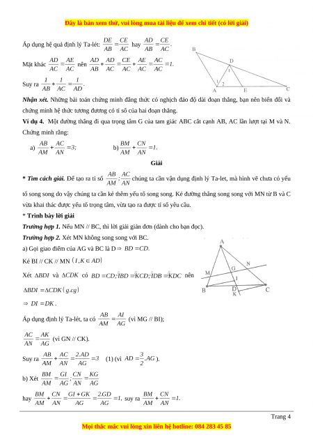 xong. Do đó vận dụng định lý Ta-lét và biến đổi linh hoạt tỷ lệ thức là yêu cầu tất yếu trong dạng toán này.