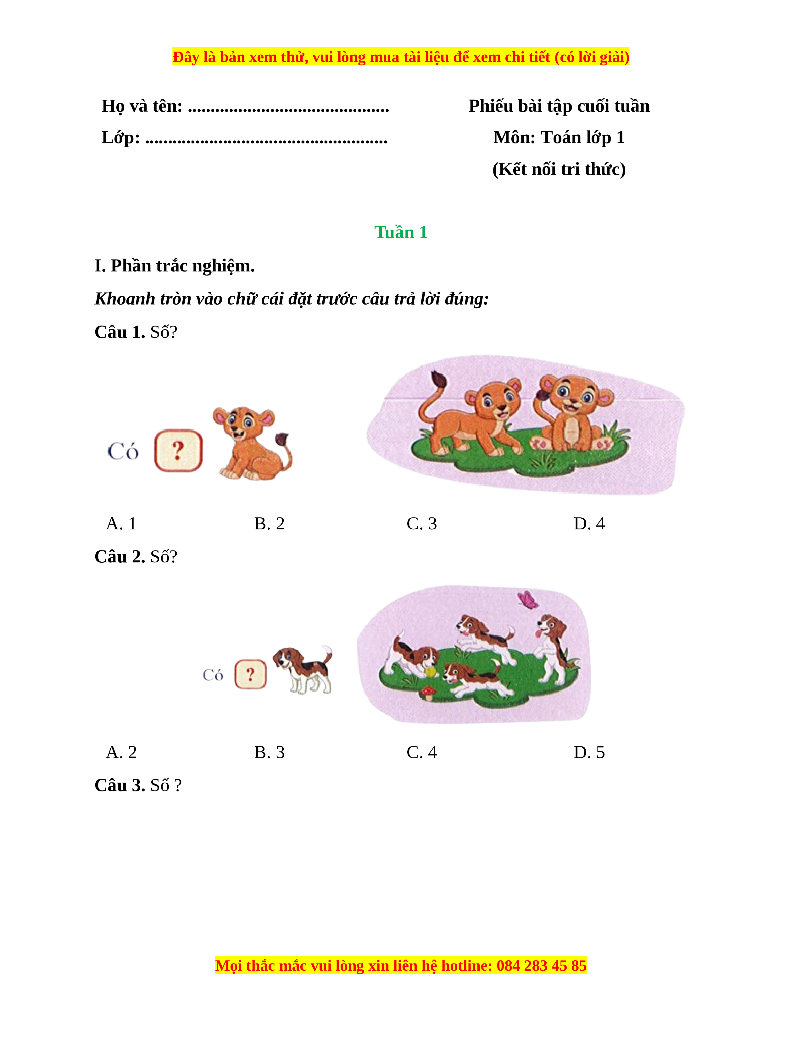 Phiếu bài tập cuối tuần Toán lớp 1 Tuần 1 Kết nối tri thức