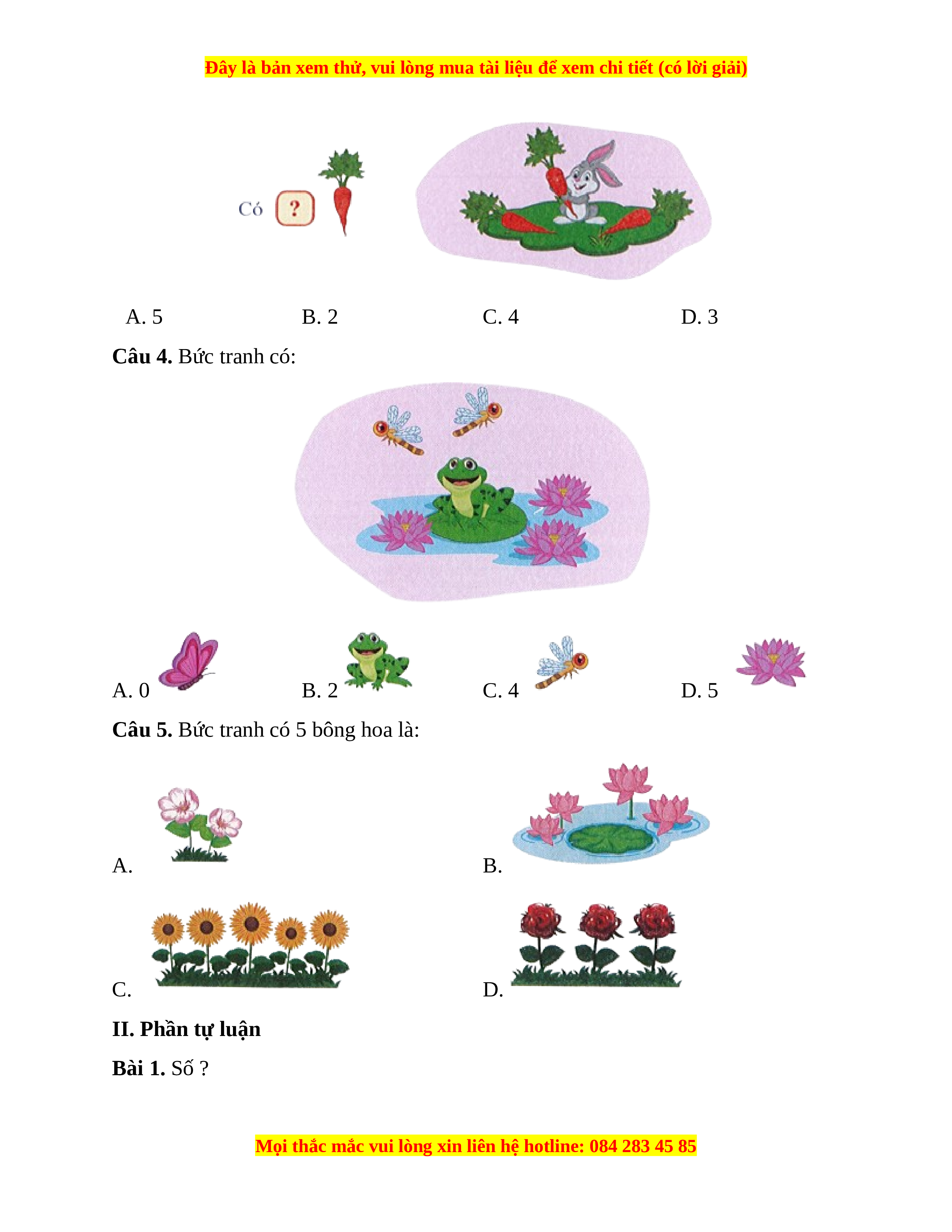 Câu 5. Bức tranh có 5 bông hoa là: A. B. C. D. II. Phần tự luận Bài 1. Số ?