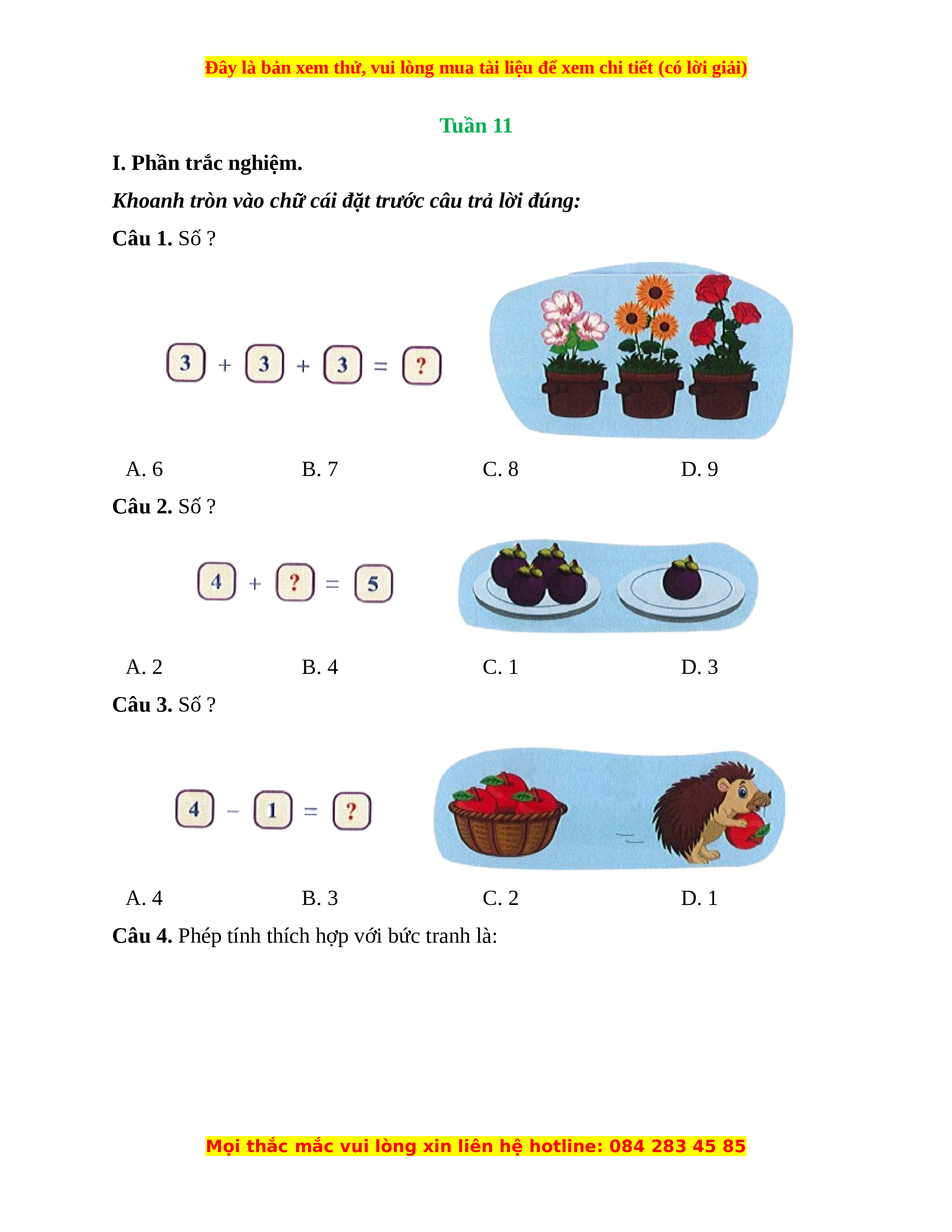 Khoanh tròn vào chữ cái đặt trước câu trả lời đúng: Câu 1. Số ? A. 6 B. 7 C. 8 D. 9 Câu 2. Số ? A. 2 B. 4 C. 1 D. 3 Câu 3. Số ? A. 4 B. 3 C. 2 D. 1