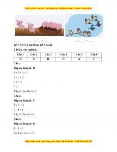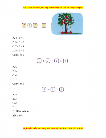 A. 4 - 3 = 1 B. 5 – 3 = 2 C. 7 – 3 = 4 D. 8 – 3 = 5 Câu 5. Số ? A. 6 B. 5 C. 4 D. 7 Câu 6. Số ? A. 4 B. 3 C. 2 D. 1 II. Phần tự luận Bài 1. Số ?
