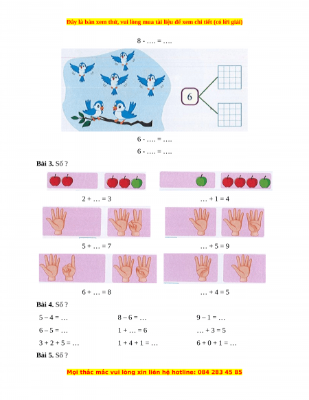 8 - …. = …. 6 - …. = …. 6 - …. = …. Bài 3. Số ? 2 + … = 3 … + 1 = 4 5 + … = 7 … + 5 = 9 6 + … = 8 … + 4 = 5 Bài 4. Số ? 5 – 4 = … 8 – 6 = … 9 – 1 = … 6 – 5 = … 1 + … = 6 … + 3 = 5 3 + 2 + 5 = … 1 + 4 + 1 = … 6 + 0 + 1 = … Bài 5. Số ?