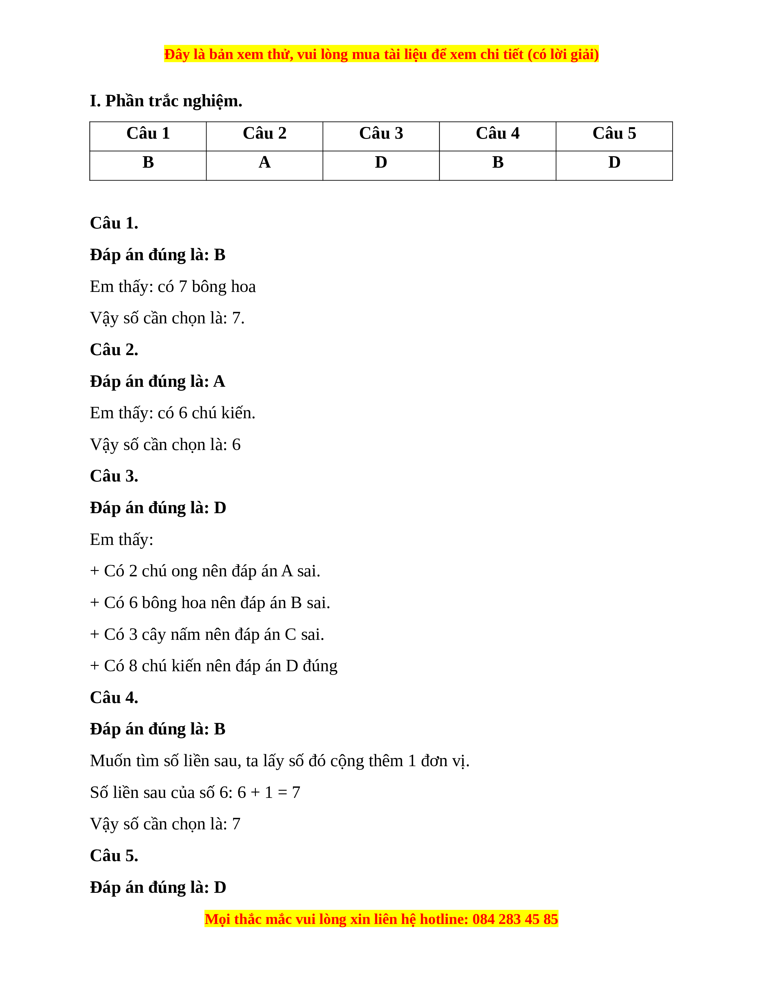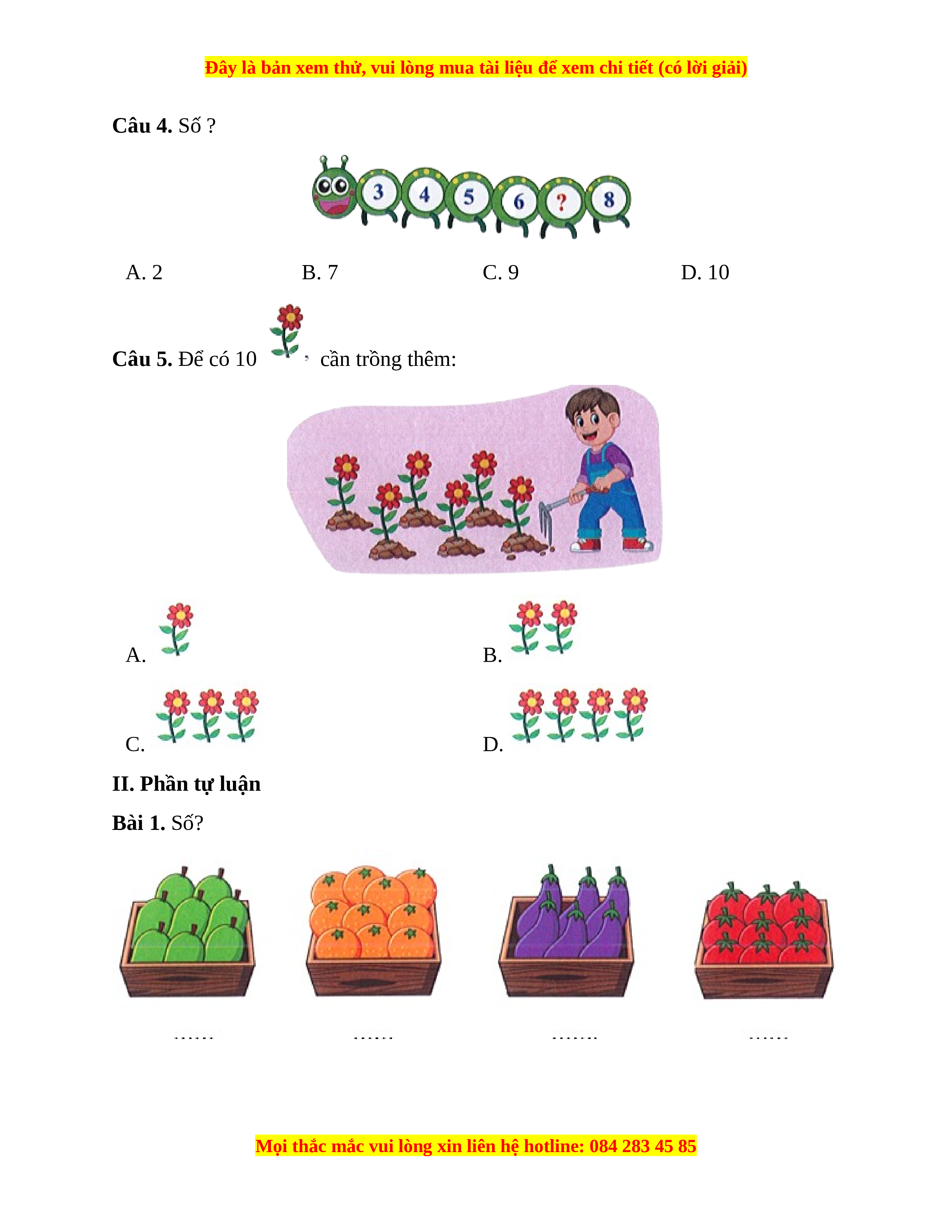 Câu 4. Số ? A. 2 B. 7 C. 9 D. 10 Câu 5. Để có 10 cần trồng thêm: A. B. C. D. II. Phần tự luận Bài 1. Số?