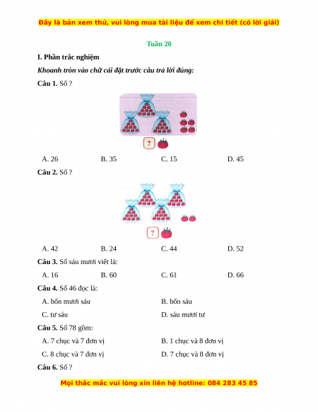 Câu 4. Số 46 đọc là: A. bốn mươi sáu B. bốn sáu C. tư sáu D. sáu mươi tư Câu 5. Số 78 gồm: A. 7 chục và 7 đơn vị B. 1 chục và 8 đơn vị C. 8 chục và 7 đơn vị D. 7 chục và 8 đơn vị Câu 6. Số ?