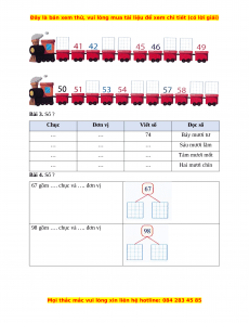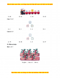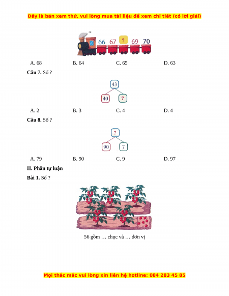 A. 68 B. 64 C. 65 D. 63 Câu 7. Số ? A. 2 B. 3 C. 4 D. 4 Câu 8. Số ? A. 79 B. 90 C. 9 D. 97 II. Phần tự luận Bài 1. Số ?