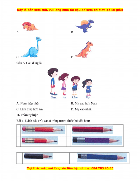 Câu 5. Câu đúng là: A. Nam thấp nhất B. My cao hơn Nam C. Lâm thấp hơn An D. My cao nhất. II. Phần tự luận