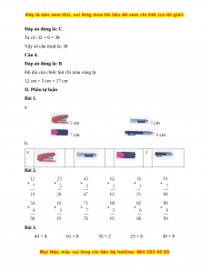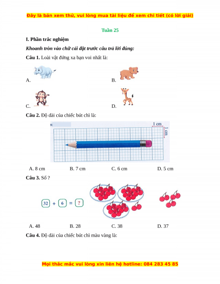 Câu 2. Độ dài của chiếc bút chì là: A. 8 cm B. 7 cm C. 6 cm D. 5 cm Câu 3. Số ? A. 48 B. 28 C. 38 D. 37